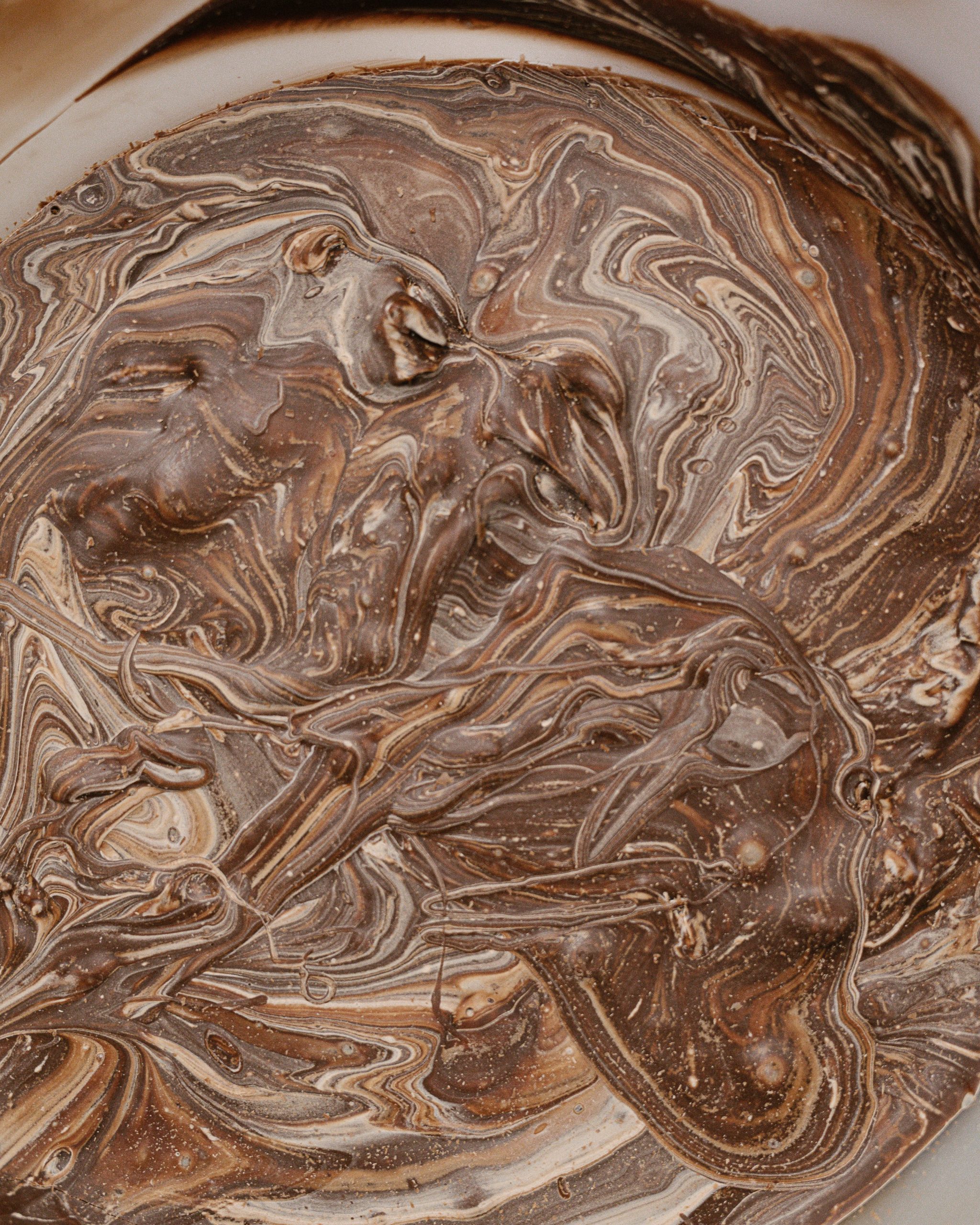 Čokolada je muhasta, zahtevna in nepredvidljiva. Zahteva popolne pogoje – pravo temperaturo, ustrezno vlago v prostoru in natančno tehniko. Gibanje je ključ njene fluidnosti, ki nam dovoli ustvarjanje. Čokolada ima svoj ritem, zato je vse v procesu obdelave podrejeno njenemu času. Vsak korak v našem studiu je premišljen in skrbno nadzorovan, saj vemo, da je čokolada živa snov – upira se hitenju in površnosti.