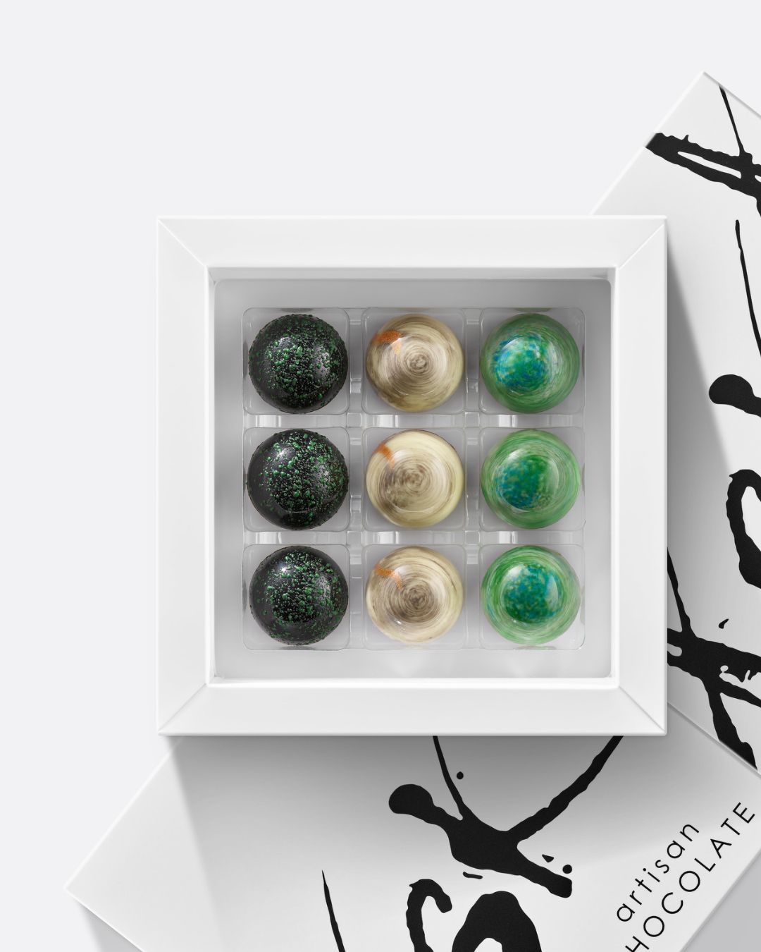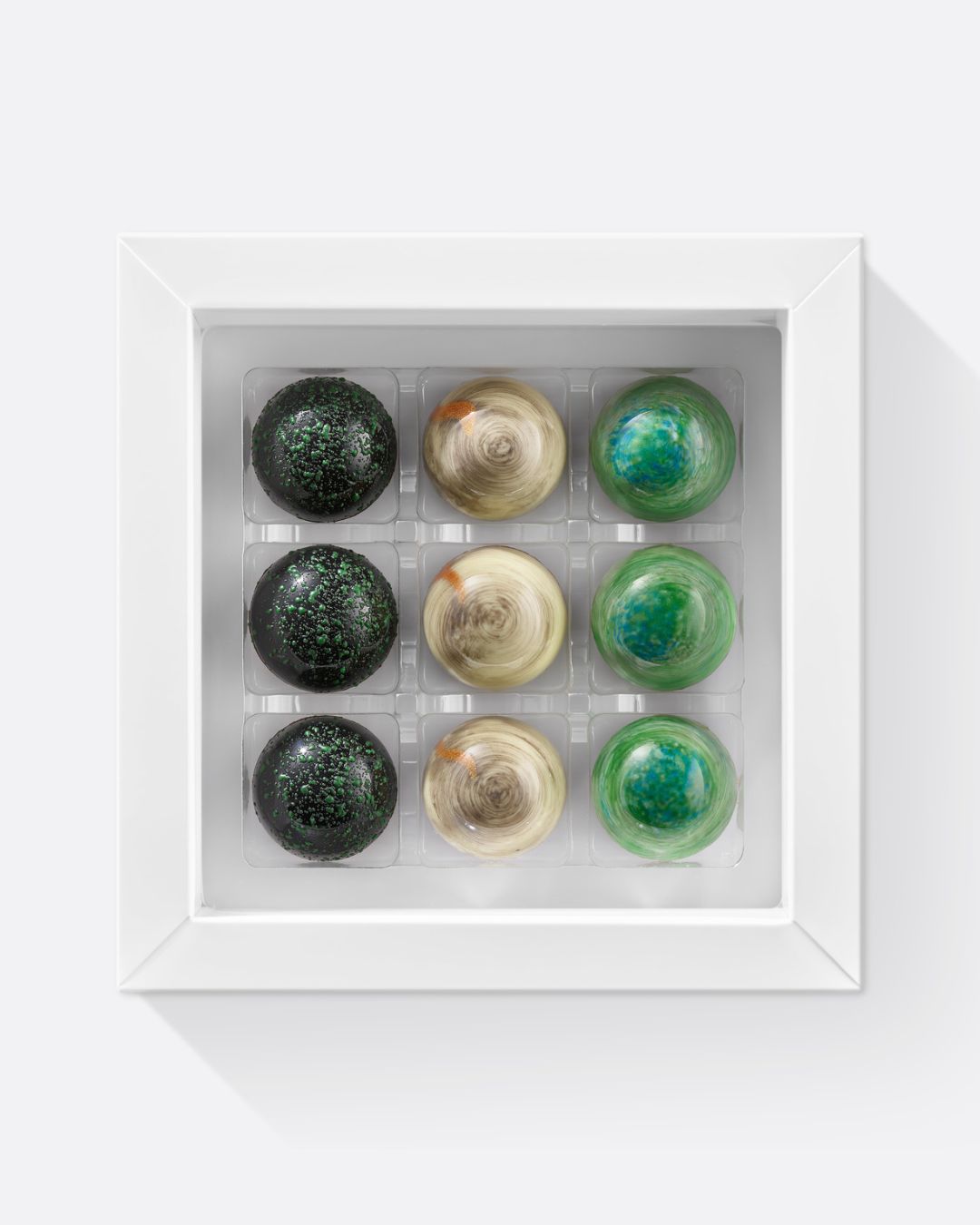 SESTAVINE: temna čokolada 70 % (kakav, kakavovo maslo, sladkor, sojin lecitin), kokosovo mleko, kakavovo maslo, sorbitol, invertni sladkor, glukoza, višnja, dekstroza, pektin, citronska kislina, bio eterično olje bele jelke. / Bela čokolada (35% in 30%), mlečna čokolada (39%) (kakavovo maslo, mleko v prahu, sladkor, sojin lecitin), smetana, sorbitol, glukoza, invertni sladkor, maslo, kakavovo maslo, črni čaj, cimet, črni poper, klinčki, kardamom. / Mlečna čokolada (39%) (kakav, kakavovo maslo, mleko v prahu, sladkor, sojin lecitin), sladkor, glukoza, smetana, divji žajbelj.